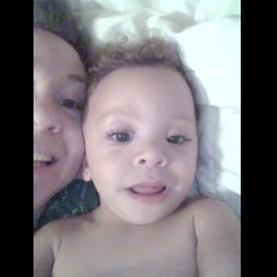 A woman in a bedroom sings and dances for a baby boy. The mom screams when she notices a man at the door filming her.