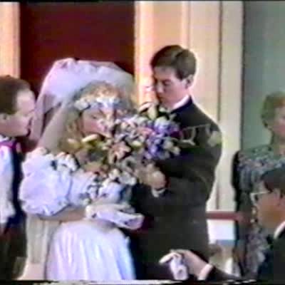 Nervous groom vomits on priest during wedding held in house. Groom's back is to us, don't see much vomit. Makes a gross sound though. Wedding. Throw up, puke.