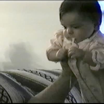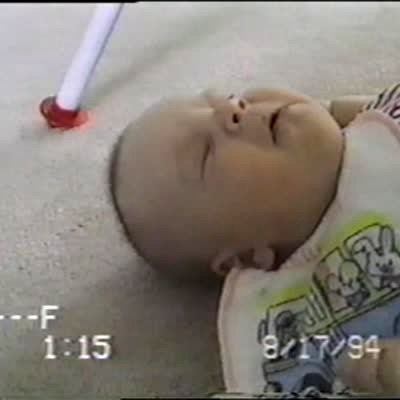 Dad holds baby on lap, opens Christmas gifts. Baby coughs, spits out pacifier, & projectile vomits / pukes. Short tail. Then fade in, dad's cleaning up. Xmas. Camera on sepia. Throw up. Holidays, presents.