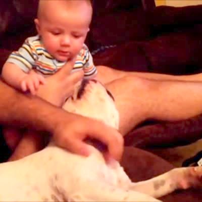 A baby boy pets a French bulldog dog indoors and throws up on him. Vomit