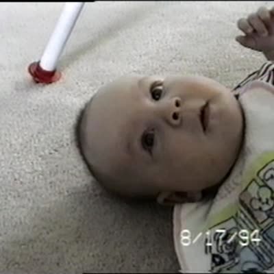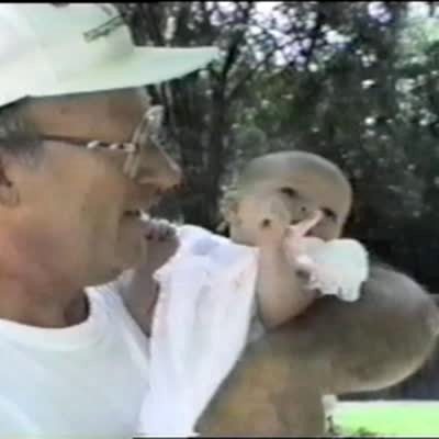 Baby boy plays with Grandpa's face while he's held in the kitchen & laughs. Senior man says "don't throw up on me" then baby spits up on him. Gross, puke, vomit. Short tails.