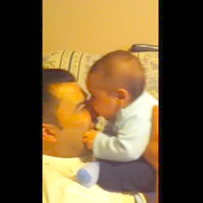Baby boy on dad's chest on couch spits up on dad's face. Gross. Vomits, throws up.