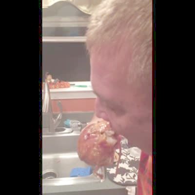 Halloween, pumpkin carving: Tot boy unexpectedly eats insides of pumpkin, makes face then vomits back into pumpkin, Great clip!