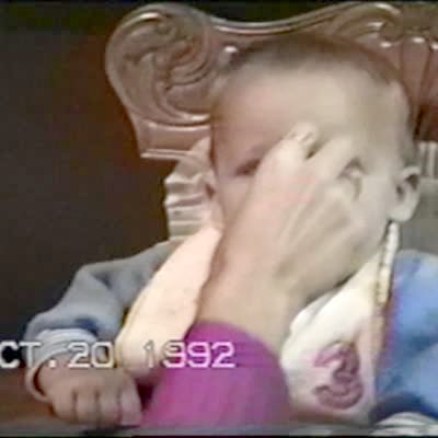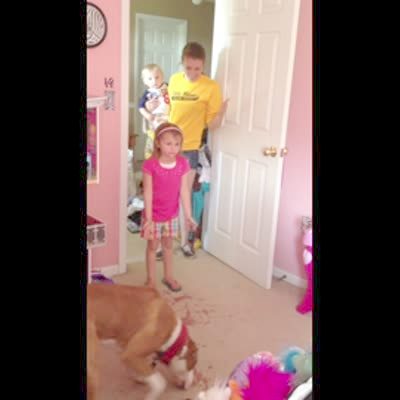 Tot boy is playing with his dad before bedtime. Boy starts coughing & suddenly vomits all over dad. Dad screams & boy laughs. Dad turns to camera & has brown puke all over him. Throw up. Gross.