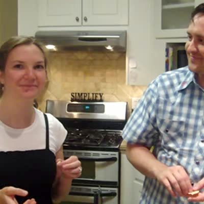 Woman eats a live worm with no problem. Man eats worm and spits it out. Family laughs. Gross.
