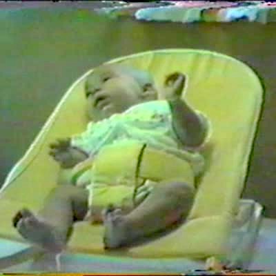A man does a face swap with a baby boy in the bedroom and the baby spits up on himself. Snapchat.