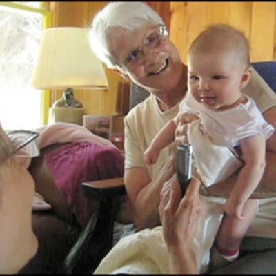 Grandma holds a baby girl in the den when mom says "That's a big smile" and the baby spits up.
