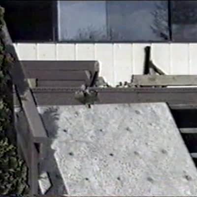 A man exits a front porch and slips and falls backwards then proceeds to cautiously waddle back down a sidewalk. Security footage.