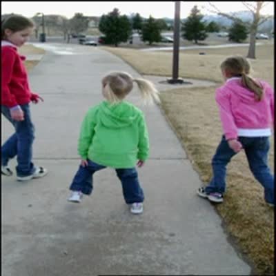 Little girl pees and poops in her pants while playing with friends on the sidewalk. She walks funny up the street.