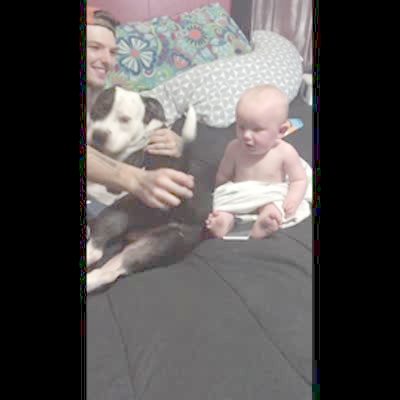 A baby boy laughs as a Pitbull dog wags his tail on a bed.