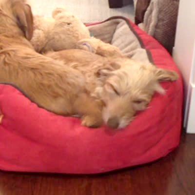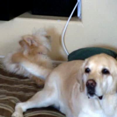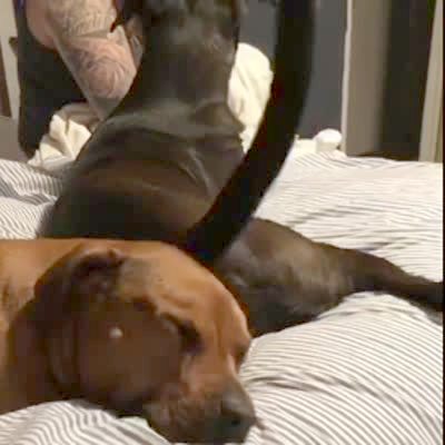 A lab dog wags its tail on a dog bed indoors when a woman says its name. Its tail repeatedly slaps a small dog in the face behind it.