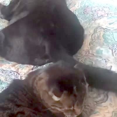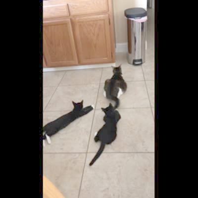 Two kitten lay on the kitchen floor behind another cat and they both swat at its tail while it wags it. Then at the end, the larger cat gets up and turns around and hits one of the kittens.