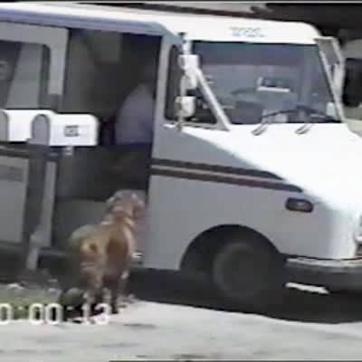 A dog runs down the stairs quickly and barks. He runs outside to a young woman who is home from college. He wags his tail and howls. Graphics. TikTok