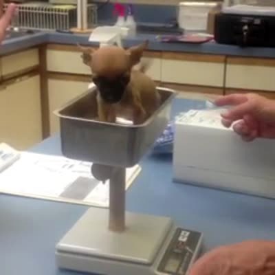 A chihuahua puppy dog wags its tail and shakes on a small scale in a vet's office.