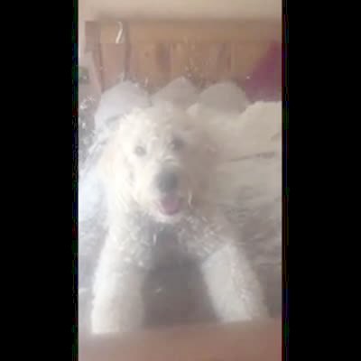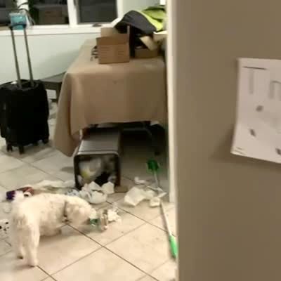 After following a trail of trash in the kitchen we see a dog with a trash lid stuck around its head.