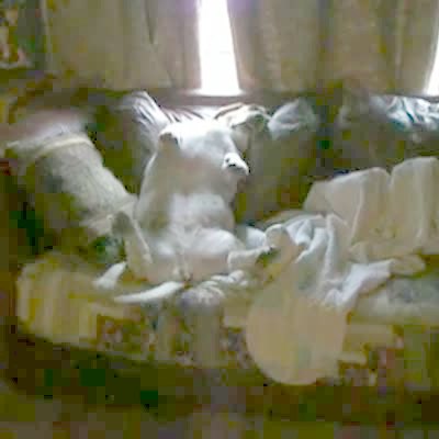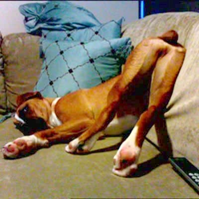 Boxer dog sleeps on couch and holds its butt in the air. Shakes / wags its stubby tail
