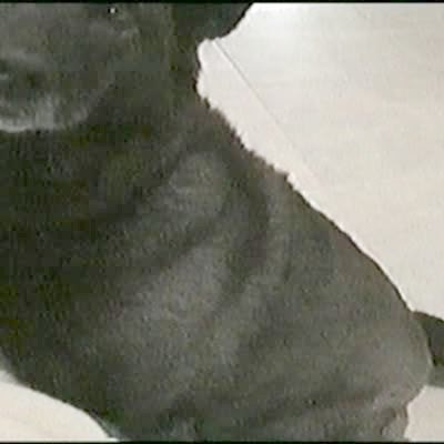 Black dog wags tail for "yes" to question "are you hungry?" and keeps tail still to answer "no" when asked "wanna go outside?" Silly pet tricks.