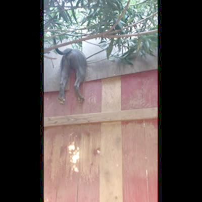 A dog's tail wags while it is stuck and its butt hangs over a fence.