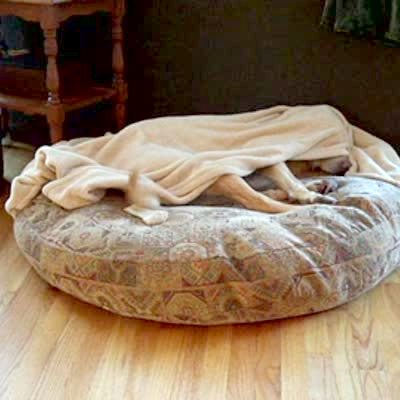 Yellow lab dog is hiding / sleeping underneath a blanket in its doggie bed, only the dog's tail sticks out and is wagging. Later the dog's nose sticks out.
