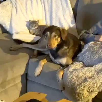 Dog lays on man's lap, man has a blanket covering the dog. When dog's tail wags, it looks like man's penis is moving. .