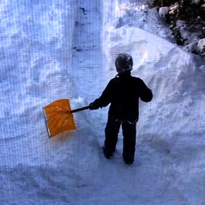 Boy shovels snow on walkway in front of house, brother sleds off ramp and lands on him. Winter. Siblings.