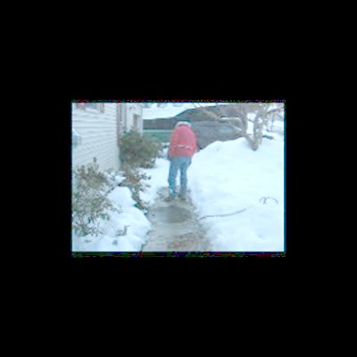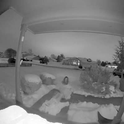 A boy slips and falls on the icy walkway to a front door in the winter snow. Security footage.