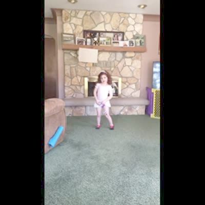 A young girl dances and twirls a baton. She throws the baton in the air and it hits pictures on a shelf, causing the whole shelf to fall and break.