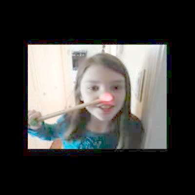 A young girl sticks a toy wand that lights up in her nose and sings "Rudolph the Red-nosed Reindeer." Christmas.