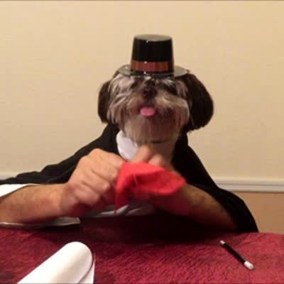 A Shih Tzu dog with hands picks up a handkerchief with one hand at a dining room table, then waves a wand with the other hand, and makes the handkerchief disappear.