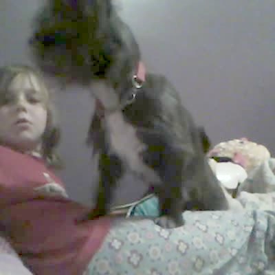 A young girl plays with her dog on a bed. The dog paws at the girl and the girl hits her head hard on the headboard of her bed.