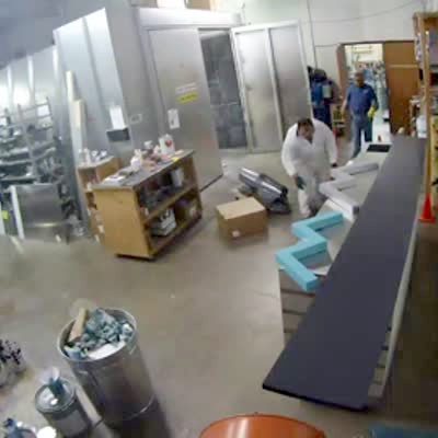 A woman accidentally knocks over a wall of cans in a warehouse causing a domino effect. Security footage.