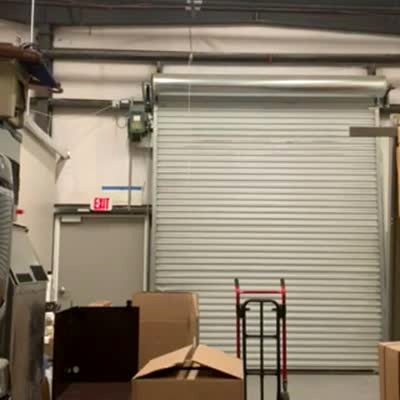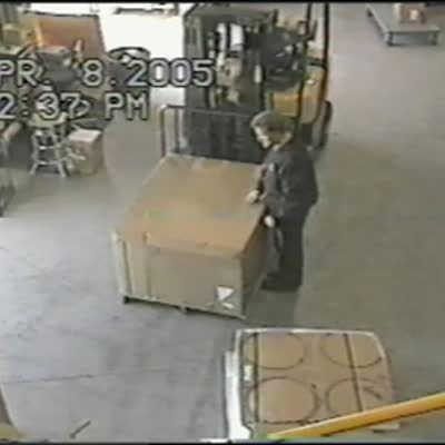 Man in warehouse opens huge cardboard box, man pops out of box and yells "Hey Jim!", scares / surprises man. Practical joke. Video shot from above. Hidden camera.