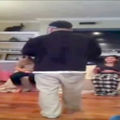 Two girls sit in chairs with a sheet stretched between them. It looks like they're sitting on a large couch but when a man tries to join them he sits down and falls through the sheet and onto the floor. The girls laugh hard, having successfully pranked him. Submitter contacted for non warped footage.