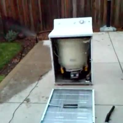 A teen girl talks about how a rat fell from her basement ceiling and into a washing machine. Then she opens the washing machine and screams when the rat jumps out and runs away. Selfie video.