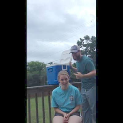 A man picks up a cooler of cold water to pour it on a woman on a porch outdoors for the cold water challenge. He accidentally drops the cooler on her head.