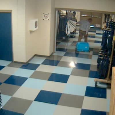 A man drops a cooler and then slips and falls on the ice water that spills on the floor. Fall is repeated.