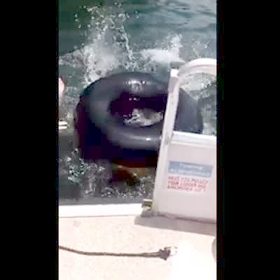 Woman scared to go from a boat and into inner tube pulls man into lake by his hair as she tries to climb into it.