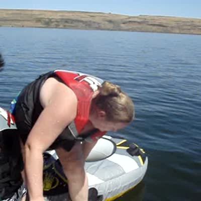 Heavy woman in pink flower bathing suit tries to get into an inner tube on the lake & flips over into the water.