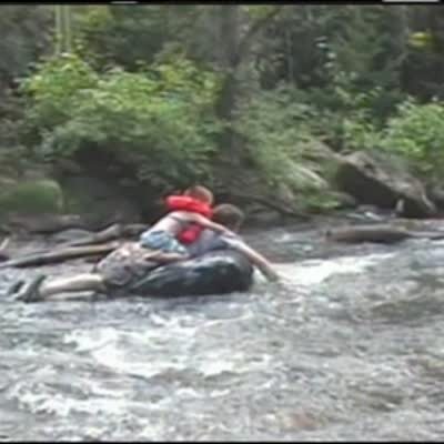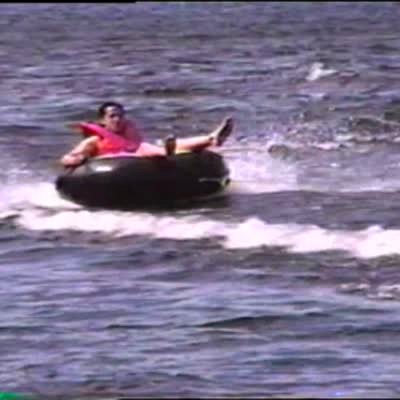 Family goes tubing together on the water, a big wave hits the inner tube & young boy is thrown about 15 feet into the air. (same clip as 656773)