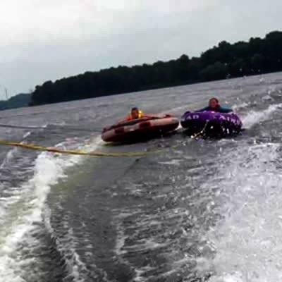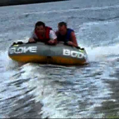 Man on water skis & man on inner tube ride behind same boat. Tube flies into the air & crashes into skier. No tail.