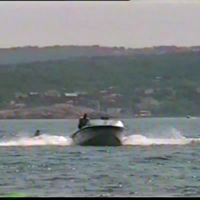 Water sports: Boy on rubber tube being pulled by boat is suddenly jerked and falls off tube.