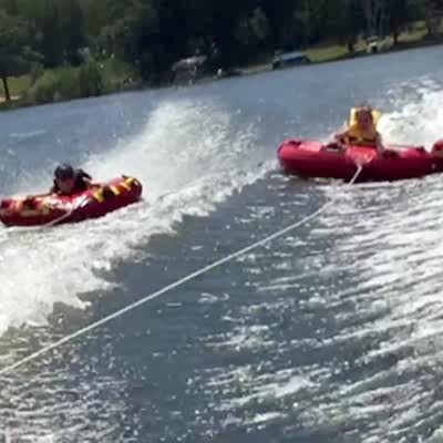 A boy and a girl ride on tubes tied to a speed boat when the boy's tube flips up and he briefly lands on the girl's tube before falling into the water and causing the girl to fall as well.