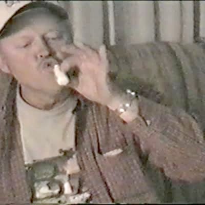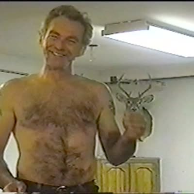 Man waxes his own chest alone in the basement. He pulls strips off yells. Has trouble getting 1 strip off looks pained. Mounted deer head in the background. Son comes in looks very confused at what dad is doing.