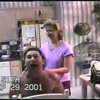 A senior woman waxes her husband's back. The man yells "holy shit" when she rips the first strip off his back and gets out of the chair when she pulls the second strip.
