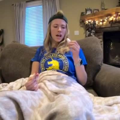 A teen girl loopy on medication in the living room pulls gauze out of her mouth and thinks they're her ears, then looks at the blood on them and says, "Look at all that ear wax".