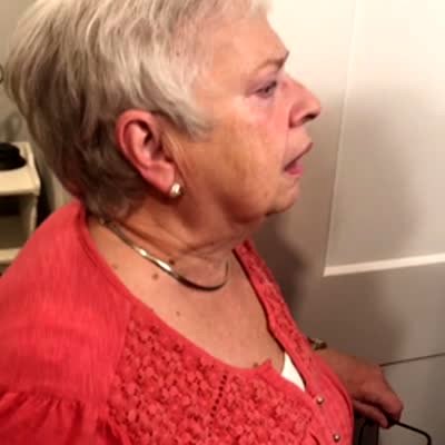 A teen girl waxes her grandmother's lip in a kitchen. At :55, the girl rips a piece off halfway, and the woman screams. A man comes over to rip the rest off and she screams again.
