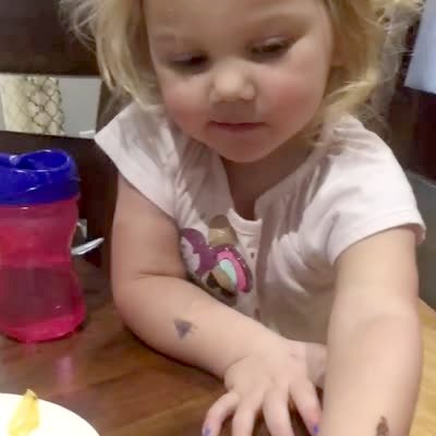 A tot girl eats a cheese wheel with the wax paper still on. The camera pans to a baby girl who shakes her head.