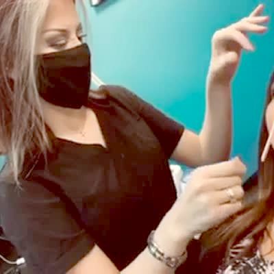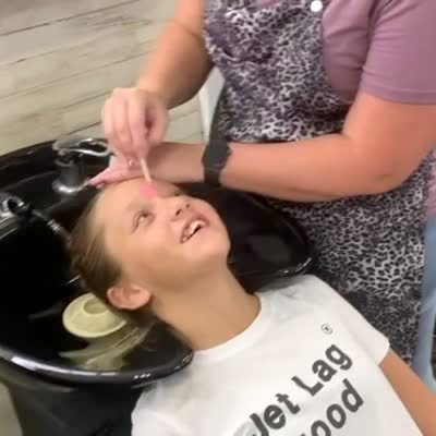 A young girl gets her eyebrows waxed in a salon for the first time. She says it doesn't hurt but then she screams.
