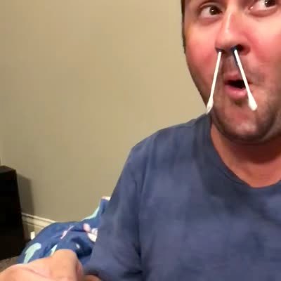 At :26, a man tries to pull a wax Q-tip out of his nose but it stays stuck. At :54, he pulls the Q-tip out but the wax stays stuck in his nostril in a bathroom.