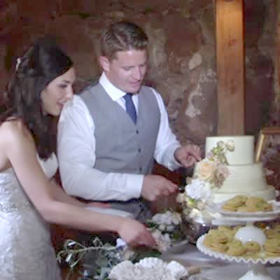 At a wedding reception, a bride smashes cake on a groom's face when he smashes some in her face and she stumbles and falls backwards. Music rights not cleared.